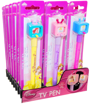 The TV Pen features a TV-shaped topper with images inside and a button on the front. Press the button to see the various images.