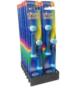 Replaceable toothbrush heads for the Light Show Electric Toothbrush. 2 heads on a blister card. All one colour: Blue (Pink also available)
